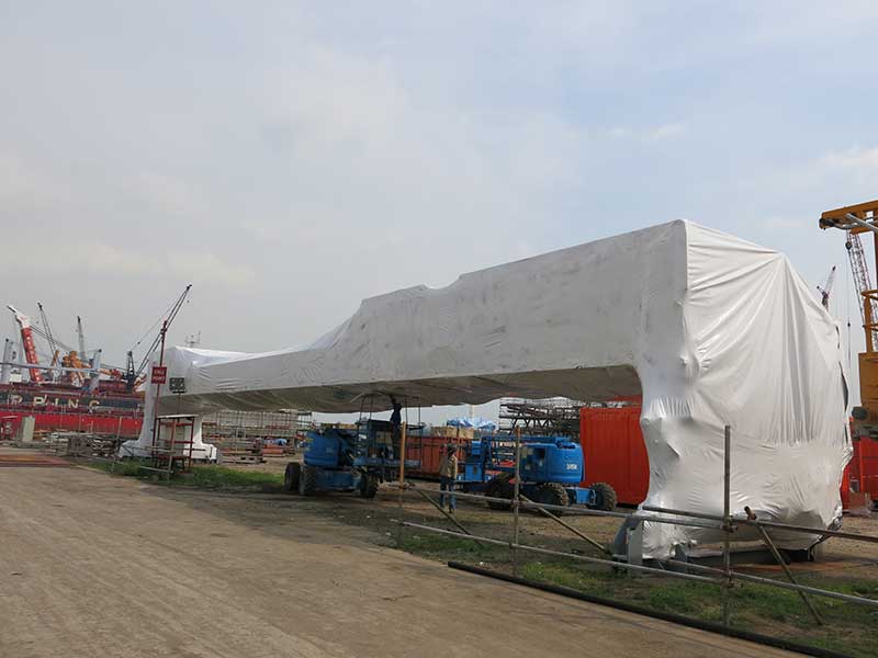 In the Port of Singapore a loading bridge was wrapped in INTERCEPT Shrink Film. The job was in particular difficult because of untoward conditions, during the rainy season in Singapore. The loading bridge is 25 m (82,0 ft) long, 6 m (19,7 ft) wide and 5 m (16,4 ft) high.